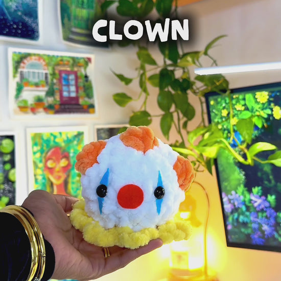 This listing is for a PDF downloadable version for the no-sew clown pattern in English. Finished plushie dimensions for size 7 yarn are approximately 4 inches wide and 4 inches tall.